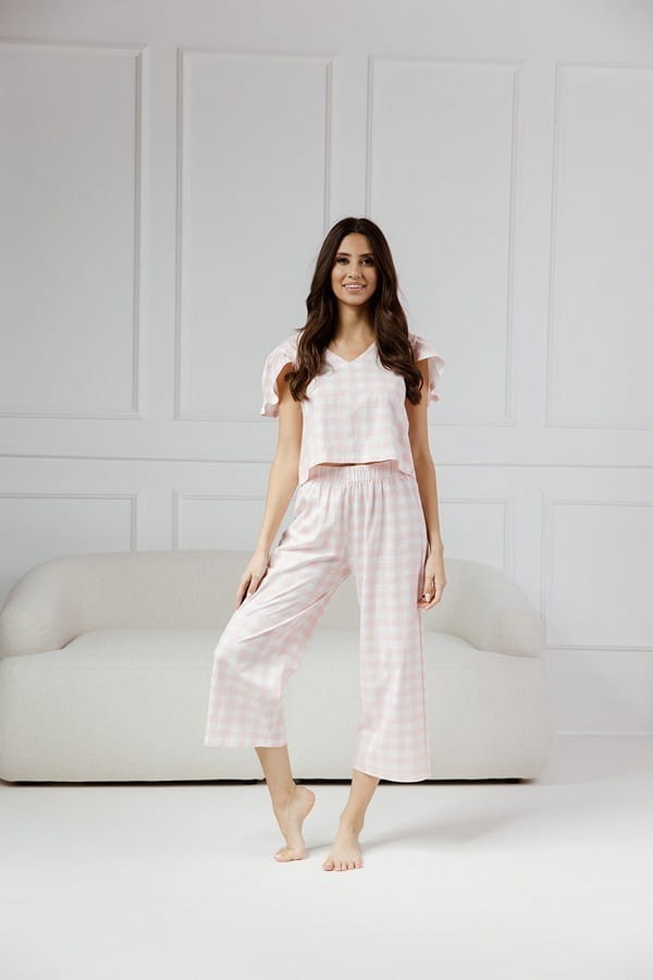 Ergänzt wird das Ensemble durch eine weite 7/8-Hose, die nicht nur ein modisches Element des Pyjamas ist, sondern auch Bewegungsfreiheit und außergewöhnlichen Tragekomfort garantiert.