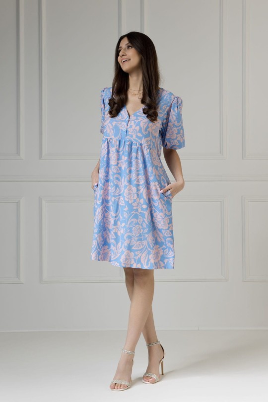 Der dezente V-Ausschnitt hat zwei abnehmbare Knöpfe (zum Stillen). Die chamoisfarbenen kurzen Ärmel sind mit einem Gummiband versehen. Direkt unter der Brust befindet sich ein elastischer Saum, von dem zahlreiche dekorative Falten, sogenannte Kellerfalten (Bauchbereich), ausgehen. Das Kleid hat außerdem funktionelle Taschen.