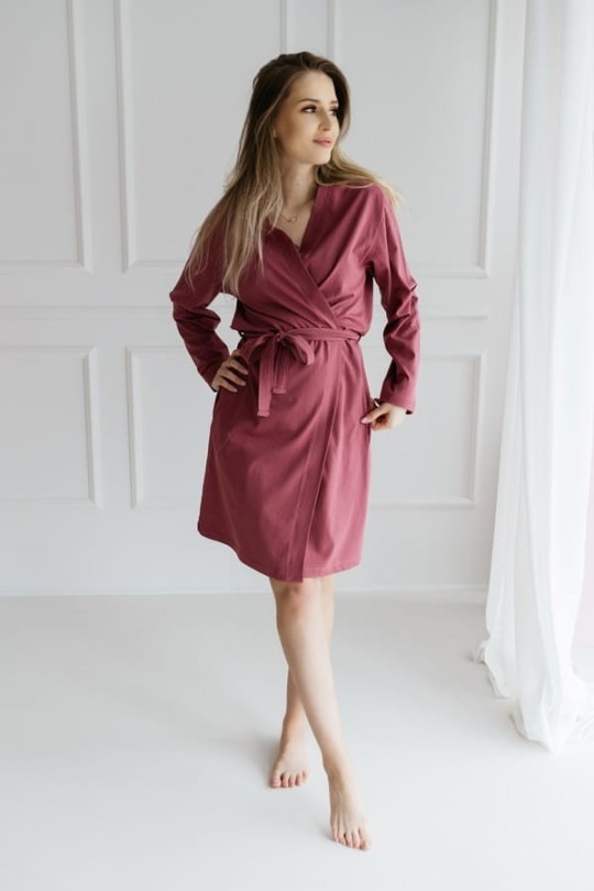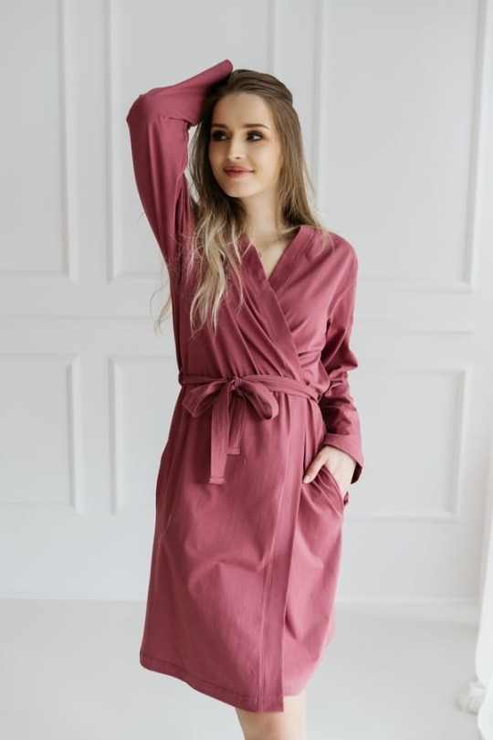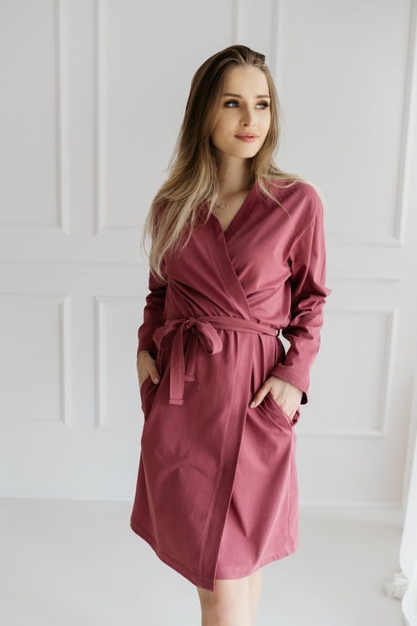 Das Modell "Ciara" hat lange Ärmel, reicht bis zum Knie und hat praktische Taschen. In der Taille wird er mit einem Baumwollgürtel gebunden. Es bietet Komfort und Bewegungsfreiheit. Ein unverzichtbares Stück für die Garderobe jeder Frau.
