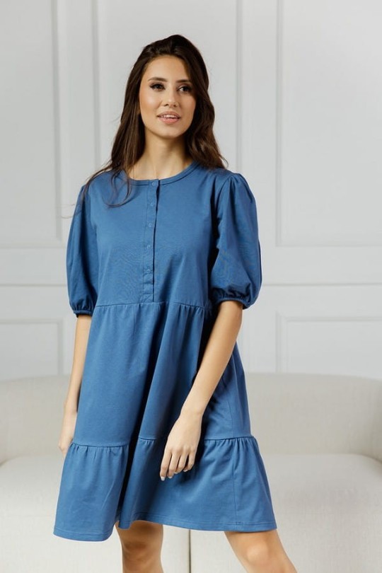 Die Besonderheit dieses Modells sind die kurzen, bauschigen Ärmel und die Rüsche am Saum, die zur allgemeinen Leichtigkeit und zum mädchenhaften Look beitragen.