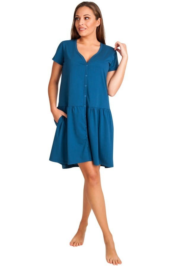 Das Stillnachthemd "Siena" wird mit nickelfreien, antiallergenen Druckknöpfen bis zum Anschlag aufgeknöpft.  Dieses Design macht das Anziehen nach einem Kaiserschnitt bequem und schmerzfrei, ohne dass man die Arme heben muss. Der offene Halsausschnitt ist außerdem ideal zum Känguruhen und Füttern Ihres Babys.
