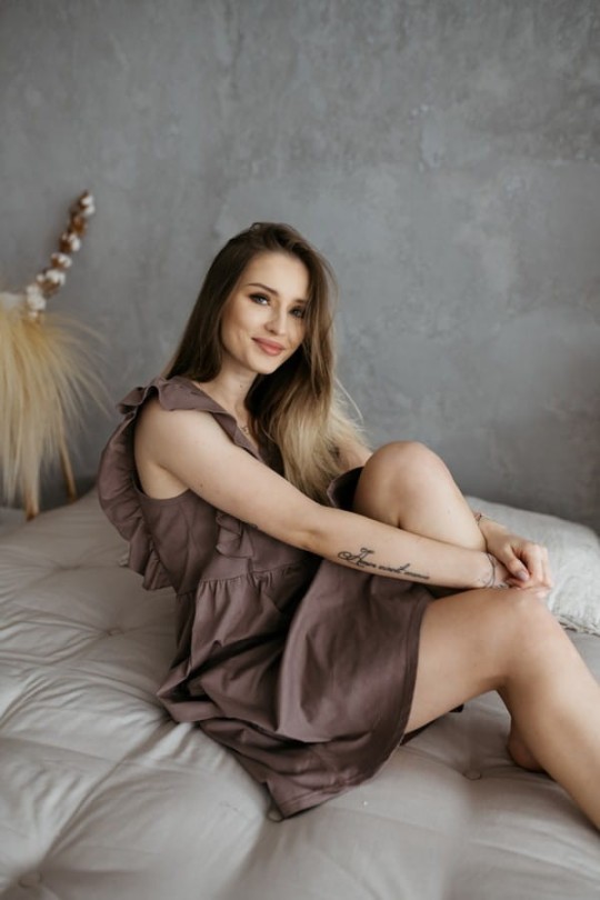 Still-Nachthemd aus Baumwolle mit praktischen Taschen. Der Kleidungsschnitt und die dekorativen Rüschen an den Schultern verleihen dem Hemd eine lässige, romantische Note. Es kann sowohl im Bett als auch tagsüber als Homewear getragen werden!